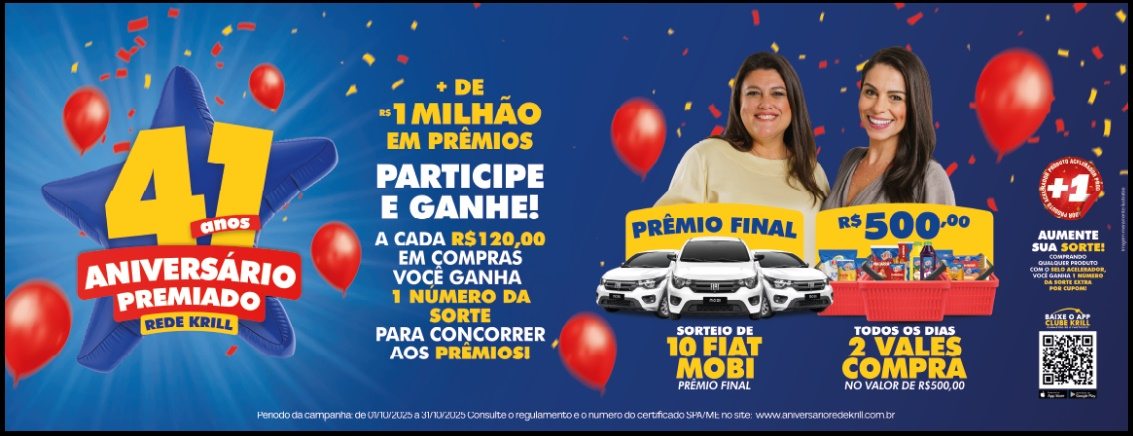 Aniversário Premiado Rede Krill! A Rede Krill está em festa! Para celebrar seus 41 anos de história, a rede preparou a promoção Aniversário Premiado 2025, com mais de R$1,4 milhão em prêmios que podem transformar suas compras em grandes conquistas. Este é o momento perfeito para encher o carrinho, aproveitar ofertas e ainda concorrer a 10 Fiat Mobi 0km e 1.364 vales-compra de R$500. A cada R$120,00 em compras, você garante números da sorte para participar dos sorteios e ainda pode ser premiado instantaneamente.
