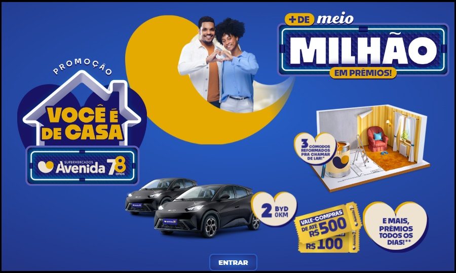 O Supermercados Avenida chega aos 78 anos de tradição com uma promoção que promete transformar a experiência de compras dos clientes em uma oportunidade única de ganhar prêmios extraordinários. Com a campanha “Você é de Casa”, você pode concorrer a dois carros elétricos BYD 0km, reformas completas em cômodos da sua residência, vales-compra de até R$ 500, além de centenas de prêmios instantâneos que são sorteados todos os dias.