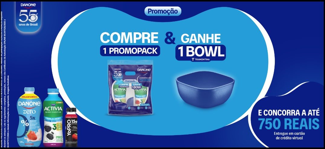 A Danone celebra 55 anos de Brasil com uma promoção exclusiva que combina brindes instantâneos e prêmios em dinheiro, transformando a experiência de consumir produtos Danone em uma oportunidade real de ganhar. Ao adquirir os packs promocionais de Activia, Danone Zero ou YoPRO, você garante um Bowl Tramontina azul de 300ml e ainda pode participar da promoção para concorrer a cartões virtuais de até R$750,00. Esta ação é uma das maiores campanhas do ano, oferecendo mais de 400 mil prêmios para consumidores de todo o Brasil.