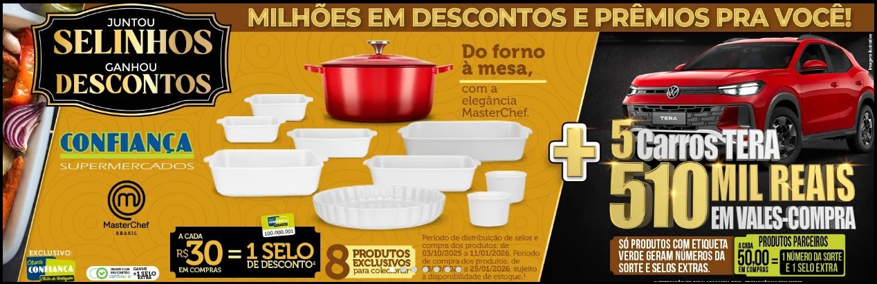 Além disso, a promoção inclui a campanha “Juntou Selinhos Ganhou Descontos”, onde a cada R$30,00 em compras, o cliente recebe um selo que pode ser trocado por produtos exclusivos da MasterChef, como panelas, travessas e outros utensílios de cozinha, a preços especiais. Comprando produtos parceiros identificados com etiqueta verde, você ainda recebe selos extras, acelerando sua coleção.