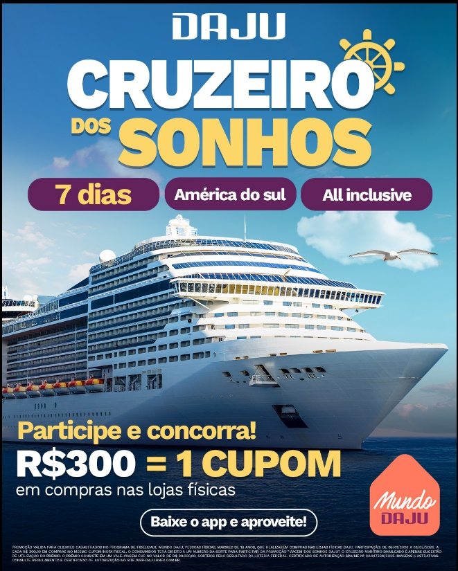 A Promoção Viagem dos Sonhos Daju 2026 representa uma oportunidade única para transformar compras corriqueiras em experiências memoráveis. Com prêmios de alto valor, participação simplificada, total transparência e integração com o programa Mundo Daju, cada cliente tem a chance real de conquistar um cruzeiro dos sonhos ou vales-compras para utilizar na rede.