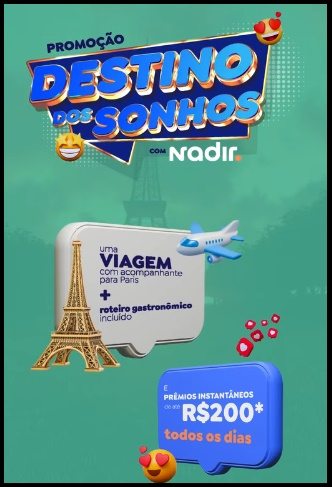 Promoção Lojas Nadir 2025! A Promoção Nadir Destino dos Sonhos 2025 chegou para encantar os consumidores que sonham em viajar e, ao mesmo tempo, querem aproveitar prêmios valiosos de forma imediata. Até o dia 31 de dezembro de 2025, qualquer pessoa que adquirir os produtos das marcas participantes poderá se cadastrar e concorrer a uma experiência incrível: uma viagem inesquecível para Paris com acompanhante e ainda a centenas de prêmios instantâneos.