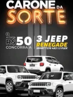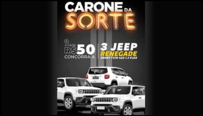 Sorteio 3 JEEP Renegade Carone! A Promoção Meu Carone da Sorte 2025 chegou para transformar a rotina de compras dos clientes dos Supermercados Carone em uma oportunidade única de ganhar prêmios incríveis. Desta vez, a grande estrela são 3 Jeep Renegade 0km, cada um avaliado em mais de R$103 mil, totalizando mais de R$300 mil em prêmios. Participar é simples, rápido e acessível a todos que fazem suas compras regularmente em qualquer unidade do Carone nos estados do Espírito Santo e Rio de Janeiro.